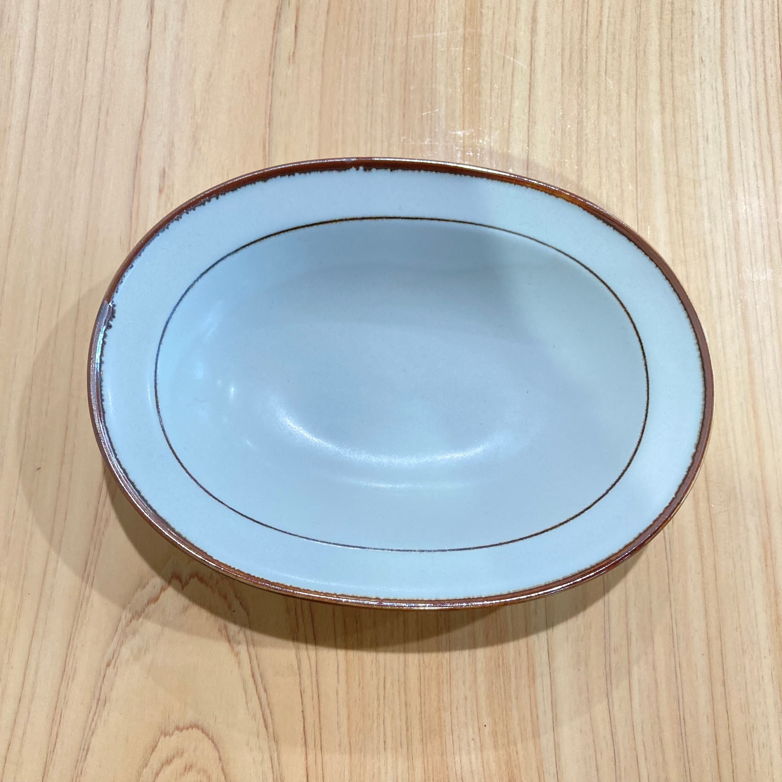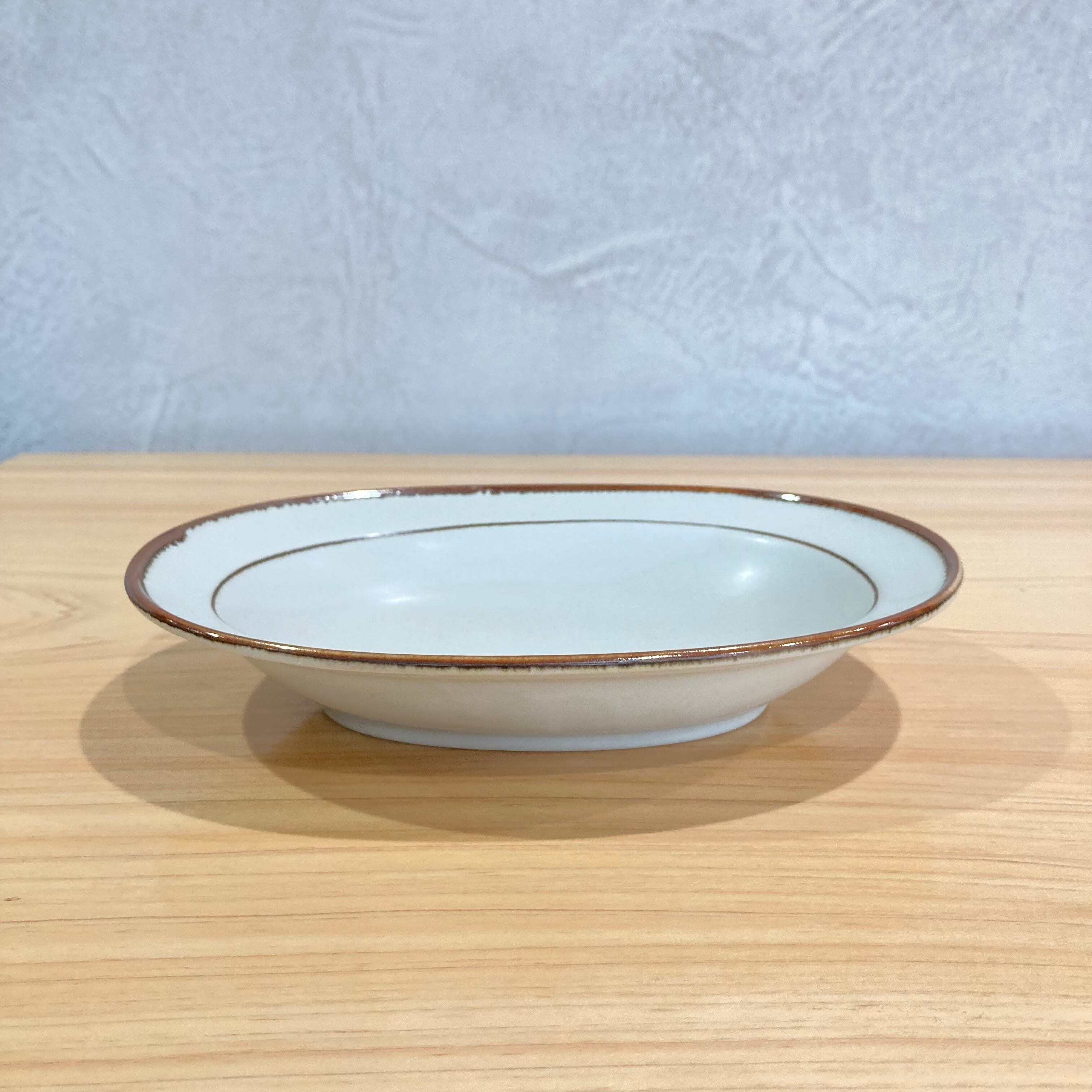 食卓にやさしい存在感を添える、マット調の白に茶色のラインが入った楕円鉢。